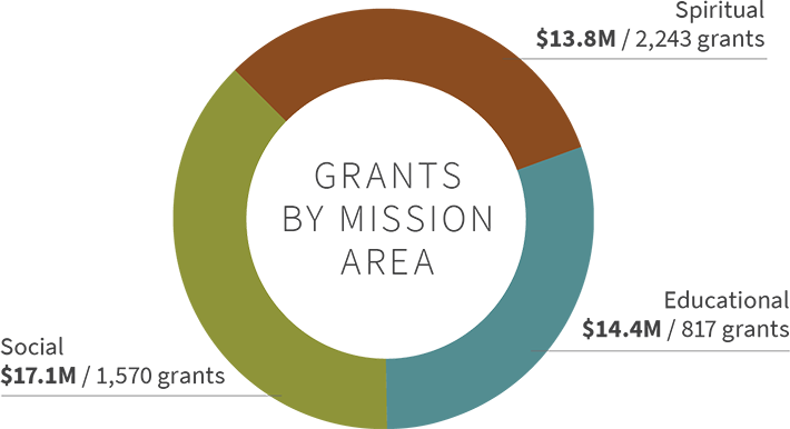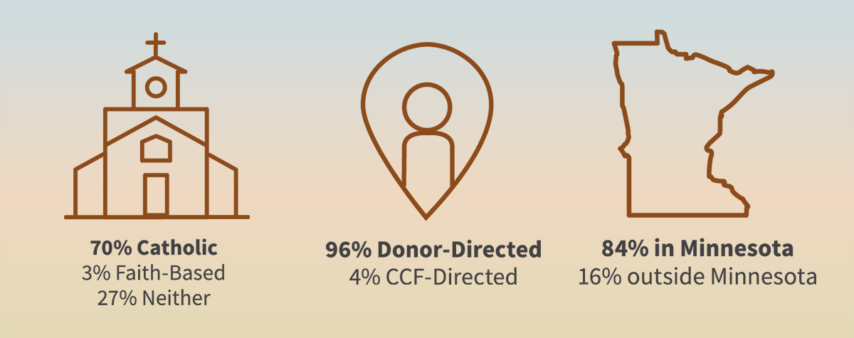 CCF distributed a record $45M in grants to 1,201 nonprofits in fiscal year 2025. The number of grants totaled 4,630. The vast majority — 96 percent — were donor-directed, while the remaining 4 percent were directed by CCF. Eighty-four percent of grant dollars stayed in Minnesota, while 16 percent was distributed outside Minnesota. Seventy percent of grants went to Catholic nonprofits and institutions, and another three percent went to other faith-based organizations. CCF has distributed $333M since 1992.